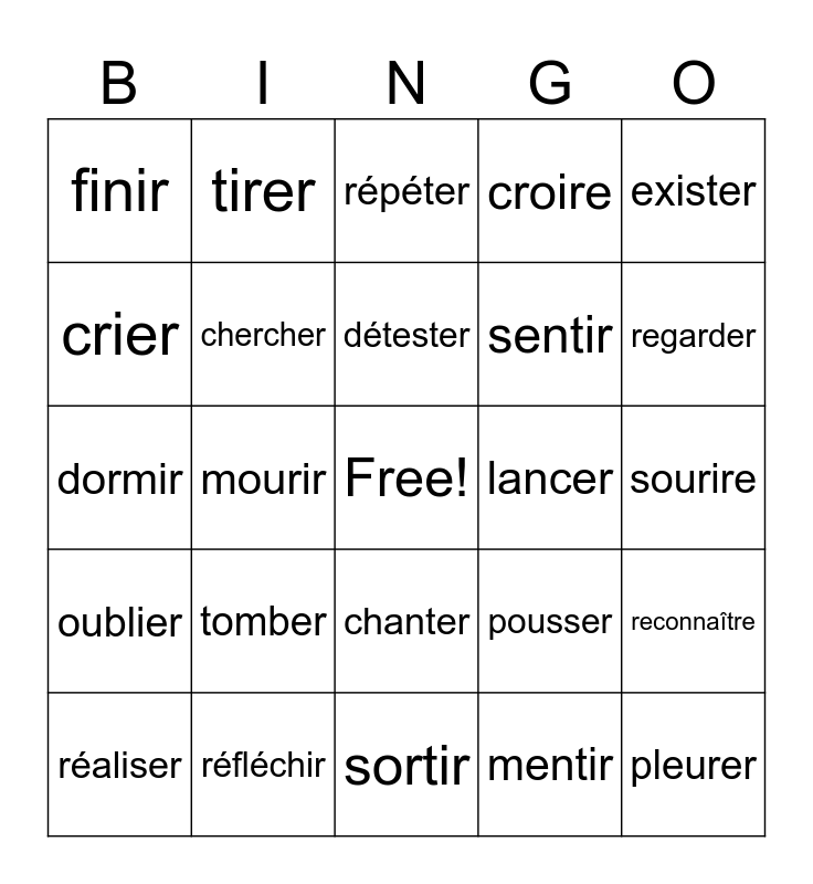 This bingo card has a free space and 35 words: aimer, aller, attraper, chercher, chanter, croire, crier, découvrir, détester, dire, dormir, exister, explorer, fermer, finir, lancer, mentir, mourir, oublier, pleurer, pousser, réaliser, reconnaître, réfléchir, répéter, regarder, réussir, risquer, sentir, sourire, souffrir, sortir, tomber, tirer and vivre.
