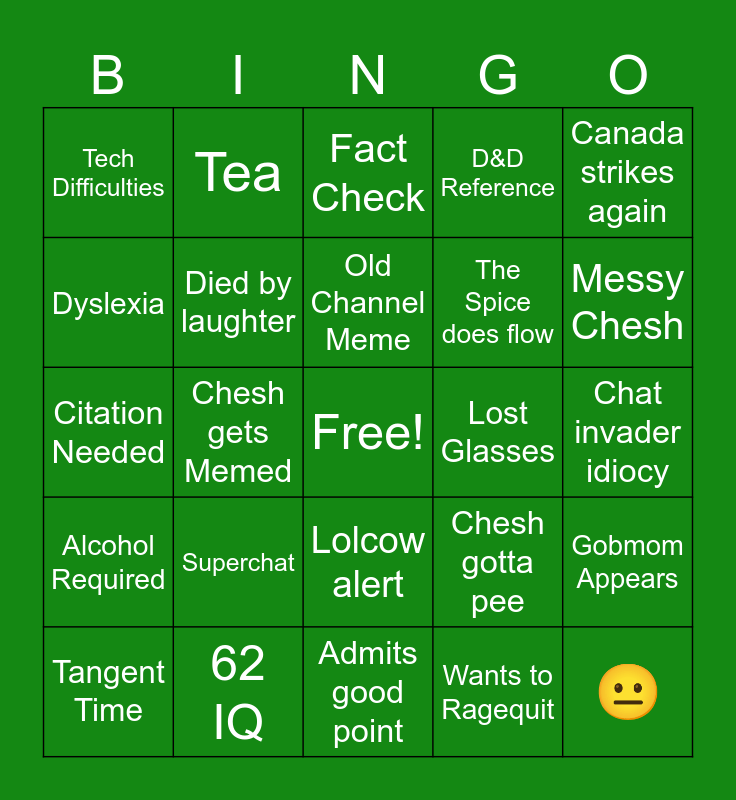 This bingo card has a free space and 24 words: Superchat, 62 IQ, Old Channel Meme, Tangent Time, Canada strikes again, Tech Difficulties, Dyslexia, Tea, Lost Glasses, Lolcow alert, The Spice does flow, Citation Needed, Chesh gotta pee, Gobmom Appears, Died by laughter, Wants to Ragequit, Chat invader idiocy, Fact Check, Messy Chesh, Chesh gets Memed, 😐, Alcohol Required, D&D Reference and Admits good point.