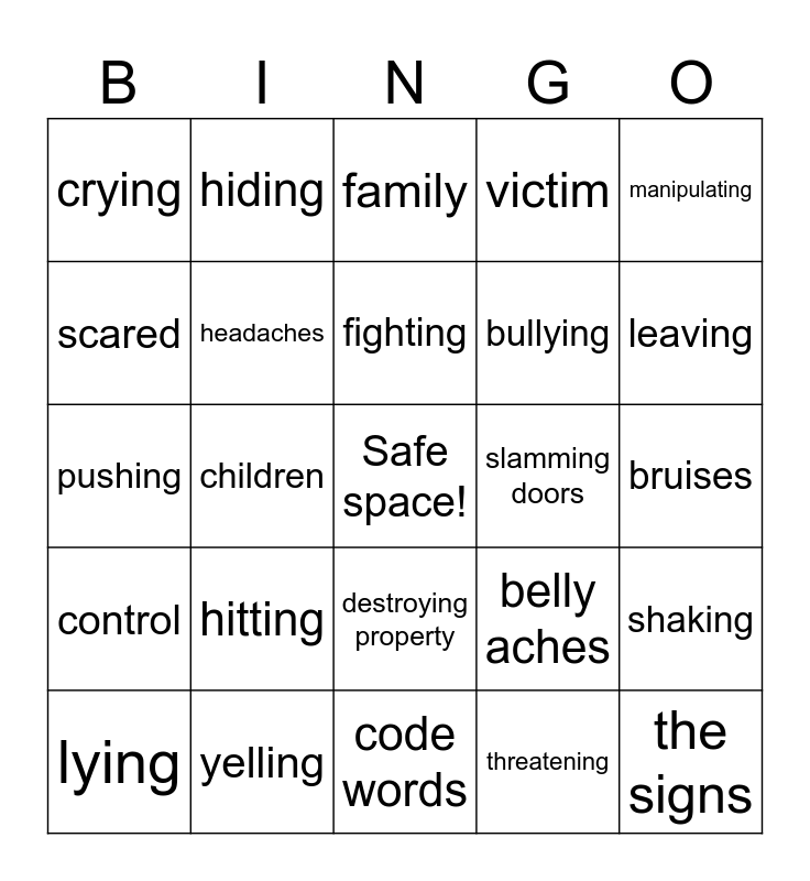 This bingo card has a free space and 24 words: hitting, yelling, fighting, lying, manipulating, crying, scared, hiding, slamming doors, destroying property, bullying, pushing, belly aches, shaking, headaches, threatening, bruises, family, leaving, children, the signs, control, victim and code words.
