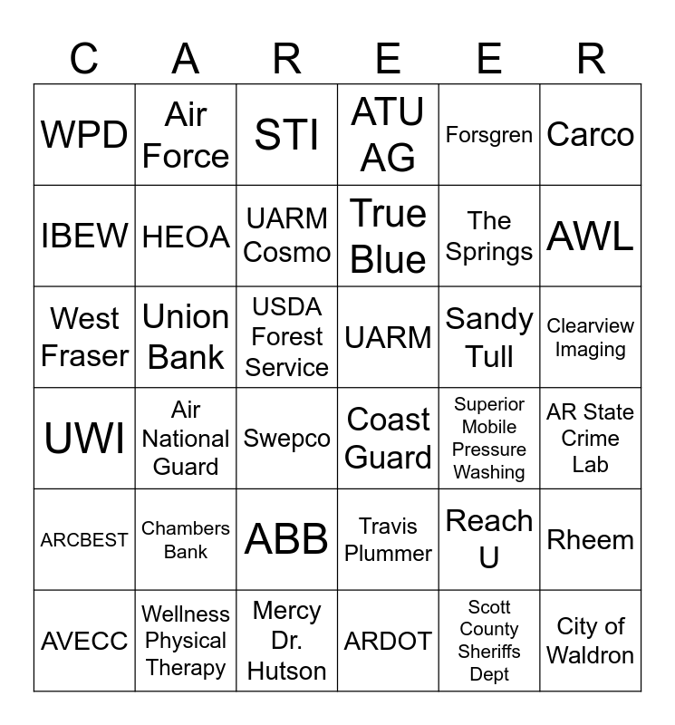 This bingo card has 36 words: Travis Plummer, ABB, ARDOT, IBEW, UWI, UARM, HEOA, Mercy Dr. Hutson, Forsgren, Reach U, AWL, ATU AG, Rheem, Union Bank, True Blue, WPD, ARCBEST, Sandy Tull, West Fraser, STI, USDA Forest Service, Air National Guard, Coast Guard, Swepco, Superior Mobile Pressure Washing, Air Force, The Springs, Wellness Physical Therapy, UARM Cosmo, Carco, City of Waldron, AVECC, AR State Crime Lab, Clearview Imaging, Chambers Bank and Scott County Sheriffs Dept.