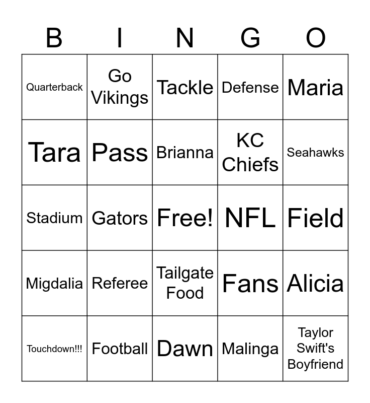 This bingo card has a free space and 24 words: Referee, Football, Brianna, Touchdown!!!, Maria, Quarterback, Tara, Go Vikings, NFL, Tailgate Food, KC Chiefs, Stadium, Fans, Alicia, Pass, Malinga, Field, Tackle, Seahawks, Gators, Taylor Swift's Boyfriend, Migdalia, Defense and Dawn.