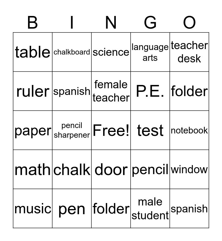 This bingo card has a free space and 24 words: chalk, pen, female teacher, music, teacher desk, table, ruler, chalkboard, test, door, P.E., paper, pencil, window, spanish, male student, notebook, science, folder, pencil sharpener, spanish, math, language arts and folder.