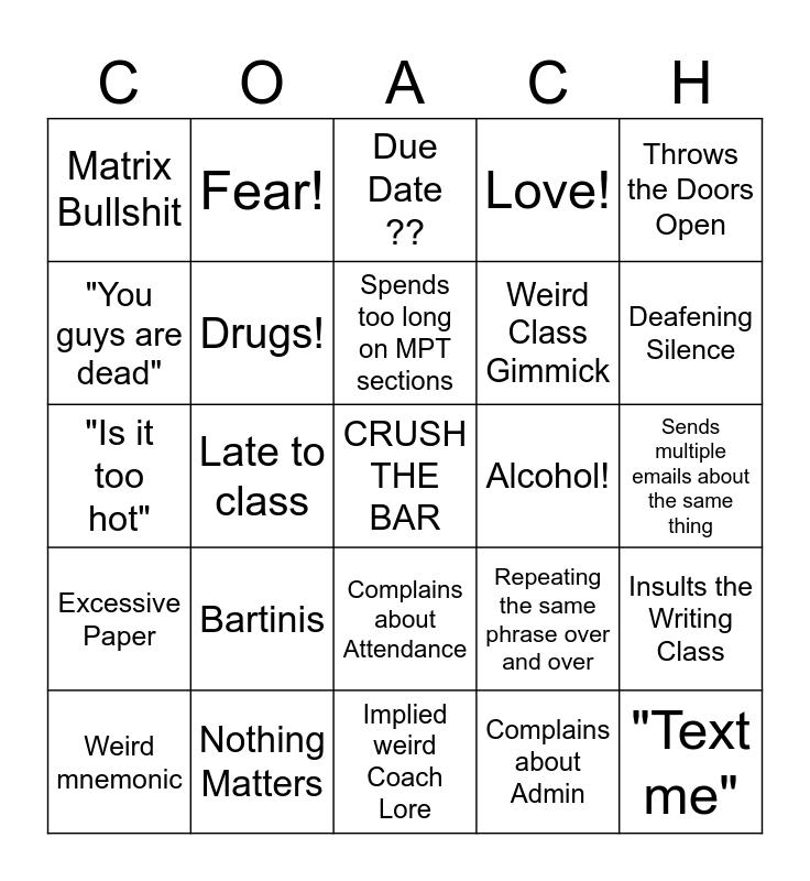 This bingo card has a free space and 24 words: Bartinis, Nothing Matters, Spends too long on MPT sections, Weird mnemonic, Throws the Doors Open, Matrix Bullshit, "You guys are dead", Fear!, Alcohol!, Complains about Attendance, Weird Class Gimmick, "Is it too hot", Repeating the same phrase over and over, Insults the Writing Class, Drugs!, Complains about Admin, Sends multiple emails about the same thing, Due Date ??, Deafening Silence, Late to class, "Text me", Excessive Paper, Love! and Implied weird Coach Lore.