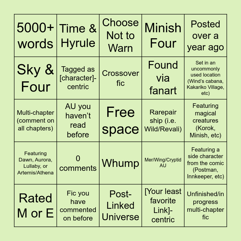 This bingo card has a free space and 24 words: 0 comments, Fic you have commented on before, Crossover fic, Rated M or E, Posted over a year ago, 5000+ words, Sky & Four, Time & Hyrule, Rarepair ship (i.e. Wild/Revali), Whump, Found via fanart, Multi-chapter (comment on all chapters), Mer/Wing/Cryptid AU, Featuring a side character from the comic (Postman, Innkeeper, etc), Tagged as [character]-centric, [Your least favorite Link]-centric, Featuring magical creatures (Korok, Minish, etc), Choose Not to Warn, Set in an uncommonly used location (Wind’s cabana, Kakariko Village, etc), AU you haven’t read before, Unfinished/in progress multi-chapter fic, Featuring Dawn, Aurora, Lullaby, or Artemis/Athena, Minish Four and Post- Linked Universe.