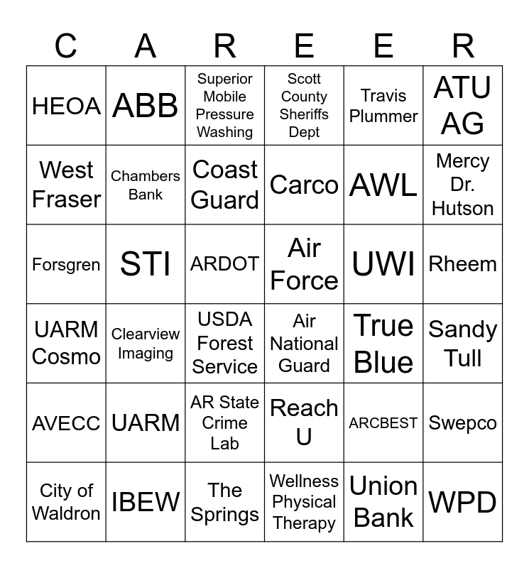 This bingo card has 36 words: UARM Cosmo, Clearview Imaging, The Springs, Carco, UWI, Rheem, HEOA, IBEW, Superior Mobile Pressure Washing, Reach U, AWL, ATU AG, AVECC, STI, Coast Guard, Scott County Sheriffs Dept, ARCBEST, Sandy Tull, West Fraser, Chambers Bank, USDA Forest Service, Air National Guard, True Blue, Swepco, Forsgren, ABB, ARDOT, Wellness Physical Therapy, Travis Plummer, Mercy Dr. Hutson, City of Waldron, UARM, AR State Crime Lab, Air Force, Union Bank and WPD.