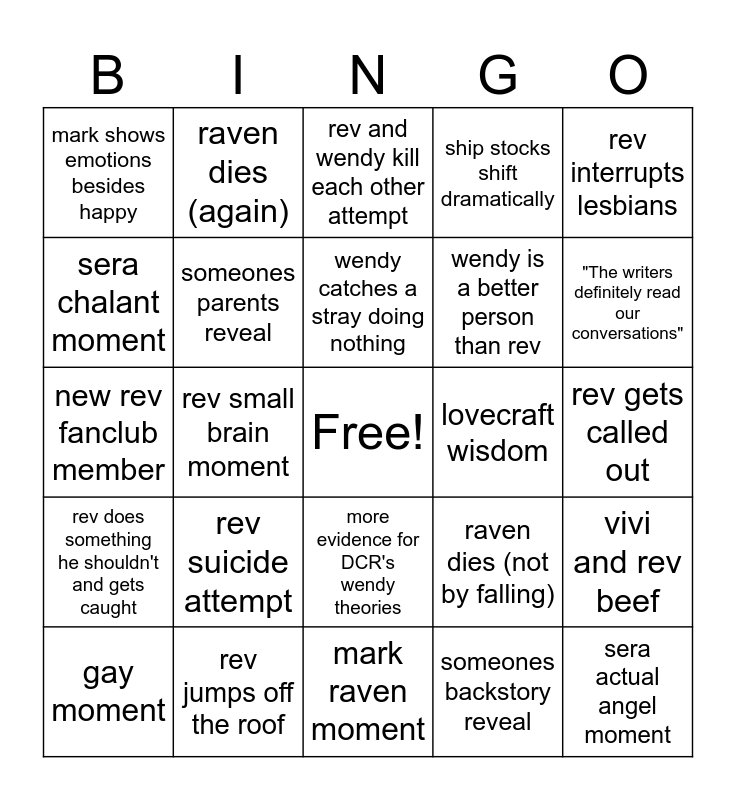 This bingo card has a free space and 24 words: rev suicide attempt, rev jumps off the roof, wendy catches a stray doing nothing, gay moment, rev interrupts lesbians, mark shows emotions besides happy, sera chalant moment, raven dies (again), lovecraft wisdom, more evidence for DCR's wendy theories, wendy is a better person than rev, new rev fanclub member, raven dies (not by falling), vivi and rev beef, someones parents reveal, someones backstory reveal, rev gets called out, rev and wendy kill each other attempt, "The writers definitely read our conversations", rev small brain moment, sera actual angel moment, rev does something he shouldn't and gets caught, ship stocks shift dramatically and mark raven moment.