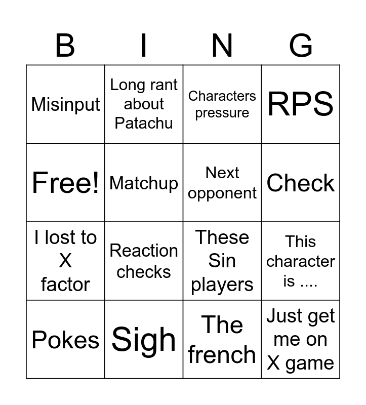 This bingo card has 16 words: Sigh, This character is ...., Characters pressure, Misinput, I lost to X factor, Long rant about Patachu, These Sin players, The french, Free!, Matchup, Pokes, RPS, Reaction checks, Check, Next opponent and Just get me on X game.