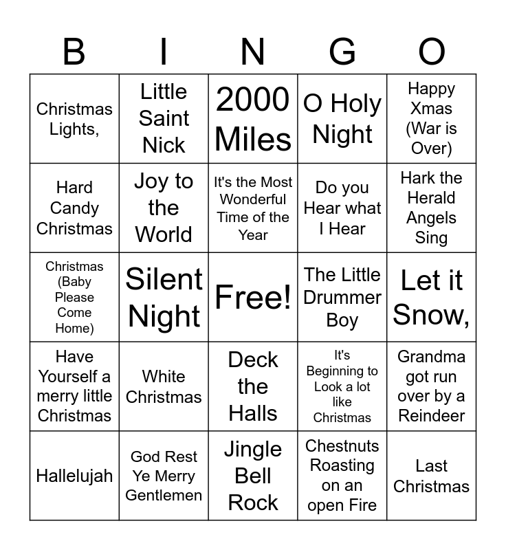 This bingo card has a free space and 49 words: All I Want for Christmas Is You, Last Christmas, Rockin Around the Christmas Tree, Jingle Bell Rock, White Christmas, Santa Baby, Little Saint Nick, Happy Holidays, Hard Candy Christmas, Christmas Wrapping, Joy to the World, O Holy Night, Grandma got run over by a Reindeer, It's Beginning to Look a lot like Christmas, Please Come Home for Christmas, Do They Know its Christmas, It's the Most Wonderful Time of the Year, The Little Drummer Boy, Holly Jolly Christmas, Happy Xmas (War is Over), Silent Night, Chestnuts Roasting on an open Fire, Christmas Lights,, Do you Hear what I Hear, Jingle Bells, Hark the Herald Angels Sing, Hallelujah, Baby it's cold outside, Deck the Halls, Have Yourself a merry little Christmas, O Christmas Tree, Blue Christmas, Dominick the Donkey, Feliz Navidad, God Rest Ye Merry Gentlemen, Mr. Heatmiser, Mr. Snowmiser, O Come All Ye Faithful, Let it Snow,, This Little Light of Mine, Rudolph the Red Nosed Reindeer, Santa Tell Me, Underneath the Tree, Sleigh Ride, Christmas (Baby Please Come Home), 2000 Miles, DJ Play a Christmas Song, Christmas Tree Farm and Mistletoe.