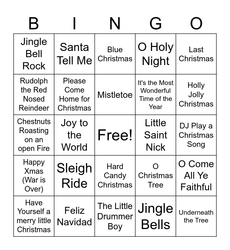 This bingo card has a free space and 49 words: White Christmas, Underneath the Tree, This Little Light of Mine, The Little Drummer Boy, Sleigh Ride, Silent Night, Santa Tell Me, Santa Baby, Rudolph the Red Nosed Reindeer, Rockin Around the Christmas Tree, Please Come Home for Christmas, O Holy Night, O Come All Ye Faithful, O Christmas Tree, Mr. Snowmiser, Mr. Heatmiser, Mistletoe, Little Saint Nick, Let it Snow,, Last Christmas, Joy to the World, Jingle Bells, Jingle Bell Rock, It's the Most Wonderful Time of the Year, It's Beginning to Look a lot like Christmas, Holly Jolly Christmas, Have Yourself a merry little Christmas, Hark the Herald Angels Sing, Hard Candy Christmas, Happy Xmas (War is Over), Happy Holidays, Hallelujah, Grandma got run over by a Reindeer, God Rest Ye Merry Gentlemen, Feliz Navidad, Dominick the Donkey, Do you Hear what I Hear, Do They Know its Christmas, DJ Play a Christmas Song, Deck the Halls, Christmas Wrapping, Christmas Tree Farm, Christmas Lights,, Christmas (Baby Please Come Home), Chestnuts Roasting on an open Fire, Blue Christmas, Baby it's cold outside, All I Want for Christmas Is You and 2000 Miles.