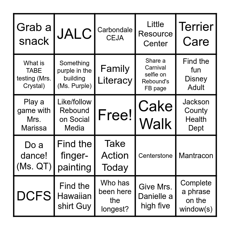 This bingo card has a free space and 24 words: Find the finger- painting, Find the Hawaiian shirt Guy, Family Literacy, DCFS, Terrier Care, Grab a snack, What is TABE testing (Mrs. Crystal), JALC, Cake Walk, Take Action Today, Share a Carnival selfie on Rebound's FB page, Play a game with Mrs. Marissa, Centerstone, Mantracon, Something purple in the building (Ms. Purple), Give Mrs. Danielle a high five, Jackson County Health Dept, Carbondale CEJA, Find the fun Disney Adult, Like/follow Rebound on Social Media, Complete a phrase on the window(s), Do a dance! (Ms. QT), Little Resource Center and Who has been here the longest?.