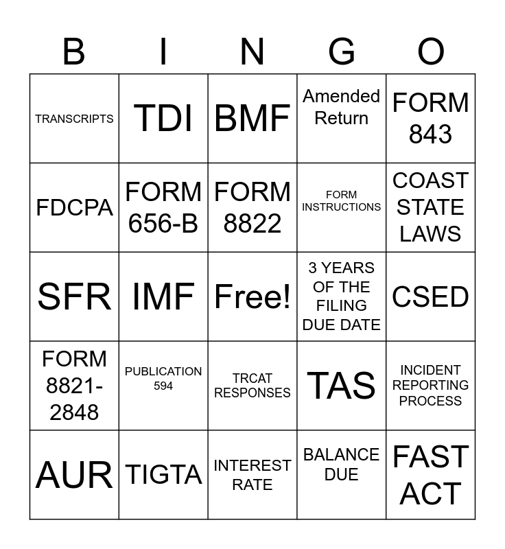 This bingo card has a free space and 24 words: AUR, PUBLICATION 594, FORM 8822, BALANCE DUE, FORM 843, TRANSCRIPTS, TDI, BMF, 3 YEARS OF THE FILING DUE DATE, CSED, SFR, FORM 656-B, TAS, INCIDENT REPORTING PROCESS, FDCPA, TIGTA, INTEREST RATE, Amended Return, COAST STATE LAWS, FORM 8821-2848, IMF, TRCAT RESPONSES, FORM INSTRUCTIONS and FAST ACT.