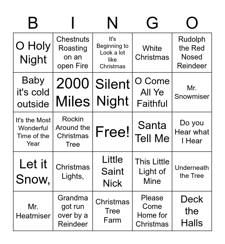This bingo card has a free space and 49 words: DJ Play a Christmas Song, Deck the Halls, Christmas Wrapping, Christmas Tree Farm, Christmas Lights,, Christmas (Baby Please Come Home), Chestnuts Roasting on an open Fire, Blue Christmas, Baby it's cold outside, All I Want for Christmas Is You, 2000 Miles, White Christmas, Underneath the Tree, This Little Light of Mine, The Little Drummer Boy, Sleigh Ride, Silent Night, Santa Tell Me, Santa Baby, Rudolph the Red Nosed Reindeer, Rockin Around the Christmas Tree, Please Come Home for Christmas, O Holy Night, O Come All Ye Faithful, O Christmas Tree, Mr. Snowmiser, Mr. Heatmiser, Mistletoe, Little Saint Nick, Let it Snow,, Hard Candy Christmas, Happy Xmas (War is Over), Happy Holidays, Hallelujah, Grandma got run over by a Reindeer, God Rest Ye Merry Gentlemen, Feliz Navidad, Dominick the Donkey, Do you Hear what I Hear, Do They Know its Christmas, Last Christmas, Joy to the World, Jingle Bells, Jingle Bell Rock, It's the Most Wonderful Time of the Year, It's Beginning to Look a lot like Christmas, Holly Jolly Christmas, Have Yourself a merry little Christmas and Hark the Herald Angels Sing.