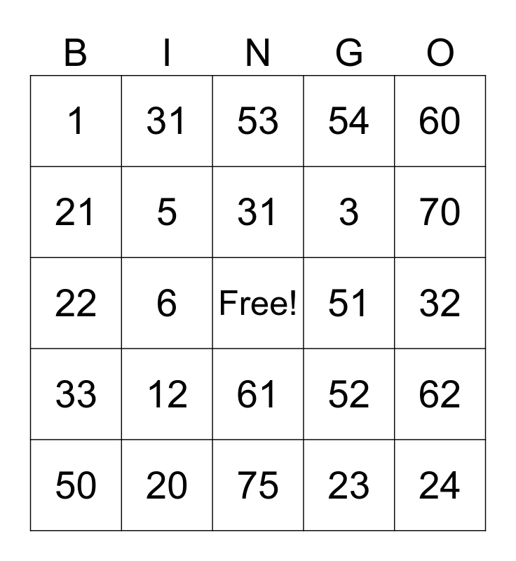 This bingo card has a free space and 24 words: 12, 20, 31, 50, 60, 1, 21, 31, 51, 61, 3, 22, 52, 62, 5, 23, 32, 53, 70, 6, 24, 33, 54 and 75.