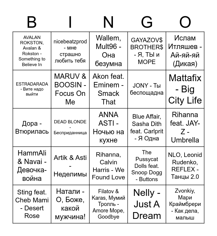 This bingo card has 90 words: Ваня Дмитриенко - Шёлк, 5sta Family - Зачем, Rihanna, Calvin Harris - We Found Love, Женя Трофимов, Комната культуры, - Поезда, ARASH & HELENA - PURE LOVE, Бонд с кнопкой - Кухни, Luis Fonsi, Daddy Yankee - Despacito, МАКSИМ - Отпускаю, ANNA ASTI - По барам, Краски - Он не знает ничего, Ахра - Карие глаза, Nelly Furtado - Say It Right, Artik & Asti - Быть Счастливой, Rihanna feat. JAY-Z - Umbrella, Ангина - Болела, Akon feat. Eminem - Smack That, Мари Краймбрери - Полюби меня пьяную, Rihanna - Diamonds, Леша Свик - Плакала, МАКSИМ - Нежность, Ramil', Елена Темникова - Из-за тебя, The Weeknd - The Hills, Filatov & Karas, Мумий Тролль - Amore Море, Goodbye, Wallem - Харизма, Дора - Втюрилась, Натали - О, Боже, какой мужчина!, Nelly Furtado feat. Timbaland - Promiscuous, HammAli, Мари Краймбрери - Медляк, Eminem feat. Rihanna - Love The Way You Lie, ANNA ASTI - Верю в тебя, Enrique Iglesias - Ring My Bells, NLO, Leonid Rudenko, REFLEX - Танцы 2.0, Мачете - Нежность, HammAli & Navai - Девочка-война, AVALAN ROKSTON, Avalan & Rokston - Something to Believe In, GAYAZOV$ BROTHER$ - Я, ТЫ и МОРЕ, Wallem, Mult96 - Она безумна, Timbaland feat. OneRepublic - Apologize, DEAD BLONDE - Бесприданница, Mattafix - Big City Life, Sting feat. Cheb Mami - Desert Rose, ESTRADARADA - Вите надо выйти, Мари Краймбрери - Пряталась в ванной, Robert M feat. Nicco - Dance Hall Track, HammAli & Navai - Ты моя химия, The Pussycat Dolls feat. Snoop Dogg - Buttons, Ramil' - Сияй, Snoop Dogg, David Guetta - Sweat, MiyaGi & Endspile, al l bo, Wooshendoo - #TAMADA, Artik & Asti, Артем Качер - Грустный дэнс, Натали Натали - Ты такой (дуэт с MC DONI), JONY - Ты беспощадна, Эльбрус Джанмирзоев feat. Alexandros Tsop - Бродяга, JONY - Комета, Оскар - Между мной, Rihanna - Russian Roulette, Blue Affair, Sasha Dith feat. Carlprit - Я Одна, Burito - Мегахит, Eminem feat. Rihanna - The Monster, Руки Вверх, Artik & Asti - Полечу за тобою, Леша Свик - Ты так пьяна, МакSим - Знаешь ли ты, Мари Краймбрери feat. M.Hu - Успей вернуться, Rita Ora - Let You Love Me, Инфинити & D.I.P Project - Я Не Боюсь, GAYAZOV$ BROTHER$ - МАЛИНОВАЯ ЛАДА, KARTASHOW, Мари Краймбрери - Золото, Nelly - Just A Dream, GAYAZOV$ BROTHER$ - Кредо, SAINt JHN feat. Imanbek - Roses, Artik & Asti - Неделимы, ANNA ASTI - Ночью на кухне, The Weeknd feat. Daft Punk - Starboy, Miyagi & Эндшпиль feat. Amigo - Самая, nicebeatzprod - мне страшно любить тебя, MARUV & BOOSIN - Focus On Me, Miyagi & Эндшпиль feat. Рем Дигга - I Got Love, Татьяна Буланова - Мой сон, INNA, Sean Paul - UP, Artik & Asti - Последний поцелуй, Zvonkiy, Мари Краймбрери - Как дела, малыш, Ислам Итляшев - Ай-яй-яй (Дикая), Artik & Asti - Девочка танцуй, JONY - Love Your Voice, Султан Лагучев - Горький вкус, IVAN VALEEV - Novella, Inna - Amazing, Zvonkiy - Голоса, Jennifer Lopez feat. Pitbull - On The Floor and Леша Свик - Малиновый свет.
