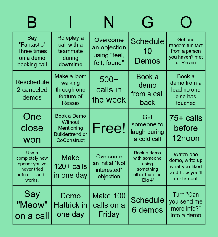 This bingo card has a free space and 24 words: Make 120+ calls in one day, Demo Hattrick in one day, 500+ calls in the week, Say "Meow" on a call, Get one random fun fact from a person you haven't met at Ressio, Say "Fantastic" Three times on a demo booking call, Reschedule 2 canceled demos, Roleplay a call with a teammate during downtime, Get someone to laugh during a cold call, Overcome an initial "Not interested" objection, Book a demo from a call back, One close won, Book a demo with someone using something other than the "Big 4", Watch one demo, write up what you liked and how you'll implement, Make a loom walking through one feature of Ressio, Schedule 6 demos, 75+ calls before 12noon, Overcome an objection using “feel, felt, found”, Book a demo from a lead no one else has touched, Book a Demo Without Mentioning Buildertrend or CoConstruct, Turn "Can you send me more info?” into a demo, Use a completely new opener you’ve never tried before — and it works., Schedule 10 Demos and Make 100 calls on a Friday.
