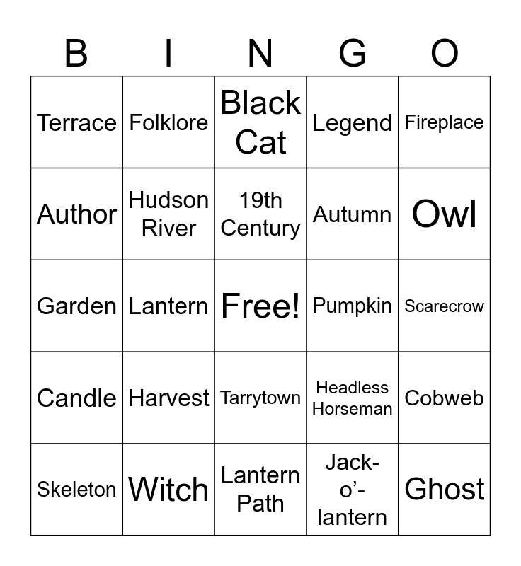 This bingo card has a free space and 35 words: Rip Van Winkle, Ichabod Crane, Sunnyside, Hudson River, Tarrytown, Legend, Author, Sketch Book, 19th Century, Gothic, Garden, Fireplace, Study, Bridge, Terrace, Pumpkin, Jack-o’-lantern, Lantern, Candle, Ghost, Headless Horseman, Skeleton, Cobweb, Witch, Black Cat, Owl, Haunted, Moonlight, Autumn, Scarecrow, Candlelight, Lantern Path, Harvest, Folklore and Storytelling.