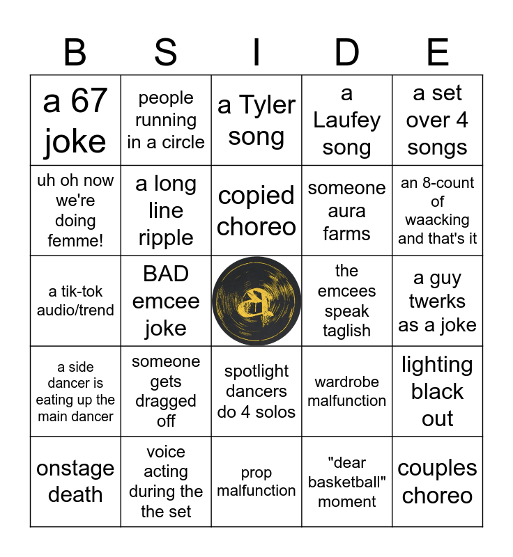 This bingo card has a free space and 29 words: onstage death, low running, BAD emcee joke, someone death drops during cypher, a 67 joke, a Tyler song, a long line ripple, someone gets dragged off, the emcees speak taglish, voice acting during the the set, a guy twerks as a joke, couples choreo, prop malfunction, "dear basketball" moment, an 8-count of waacking and that's it, someone gets thrown or lifted, spotlight dancers do 4 solos, a side dancer is eating up the main dancer, a set over 4 songs, a tik-tok audio/trend, wardrobe malfunction, intro video with subtitles, someone aura farms, uh oh now we're doing femme!, a Laufey song, people running in a circle, lighting black out, copied choreo and FOB gets 1st or 2nd place.