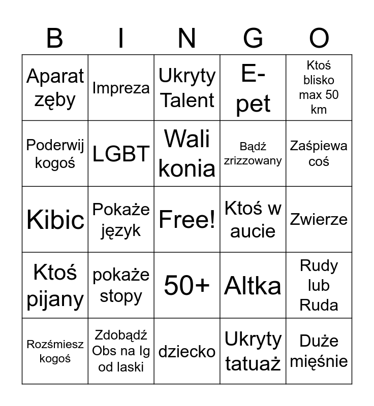 This bingo card has a free space and 24 words: pokaże stopy, Zdobądź Obs na Ig od laski, Wali konia, Rozśmiesz kogoś, Ktoś blisko max 50 km, Aparat zęby, Poderwij kogoś, Impreza, Ktoś w aucie, 50+, Bądź zrizzowany, Kibic, Altka, Rudy lub Ruda, LGBT, Ukryty tatuaż, Zwierze, Ukryty Talent, Zaśpiewa coś, Pokaże język, Duże mięśnie, Ktoś pijany, E-pet and dziecko.