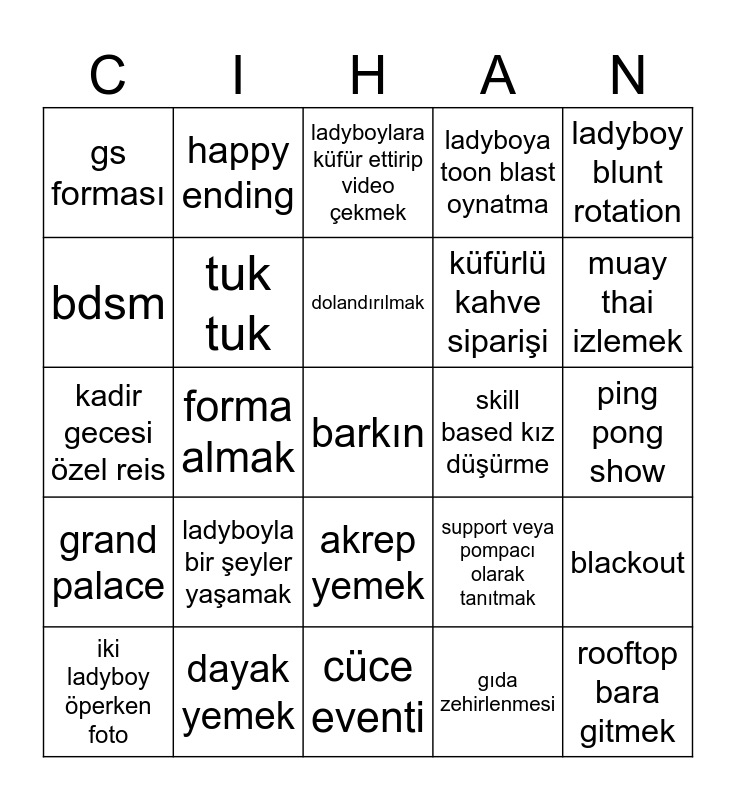 This bingo card has a free space and 24 words: ladyboyla bir şeyler yaşamak, dayak yemek, dolandırılmak, iki ladyboy öperken foto, ladyboy blunt rotation, gs forması, bdsm, happy ending, skill based kız düşürme, akrep yemek, küfürlü kahve siparişi, kadir gecesi özel reis, support veya pompacı olarak tanıtmak, blackout, tuk tuk, gıda zehirlenmesi, ping pong show, ladyboylara küfür ettirip video çekmek, muay thai izlemek, forma almak, rooftop bara gitmek, grand palace, ladyboya toon blast oynatma and cüce eventi.