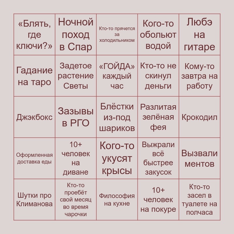 This bingo card has 25 words: Оформленная доставка еды, Кто-то проебёт свой месяц во время чарочки, Блёстки из-под шариков, 10+ человек на покуре, Любэ на гитаре, «Блять, где ключи?», Ночной поход в Спар, Кто-то прячется за холодильником, Разлитая зелёная фея, Вызвали ментов, Гадание на таро, Задетое растение Светы, Философия на кухне, Выжрали всё быстрее закусок, Кому-то завтра на работу, Шутки про Климанова, Зазывы в РГО, «ГОЙДА» каждый час, Кто-то не скинул деньги, Крокодил, Джэкбокс, 10+ человек на диване, Кого-то укусят крысы, Кого-то обольют водой and Кто-то засел в туалете на полчаса.