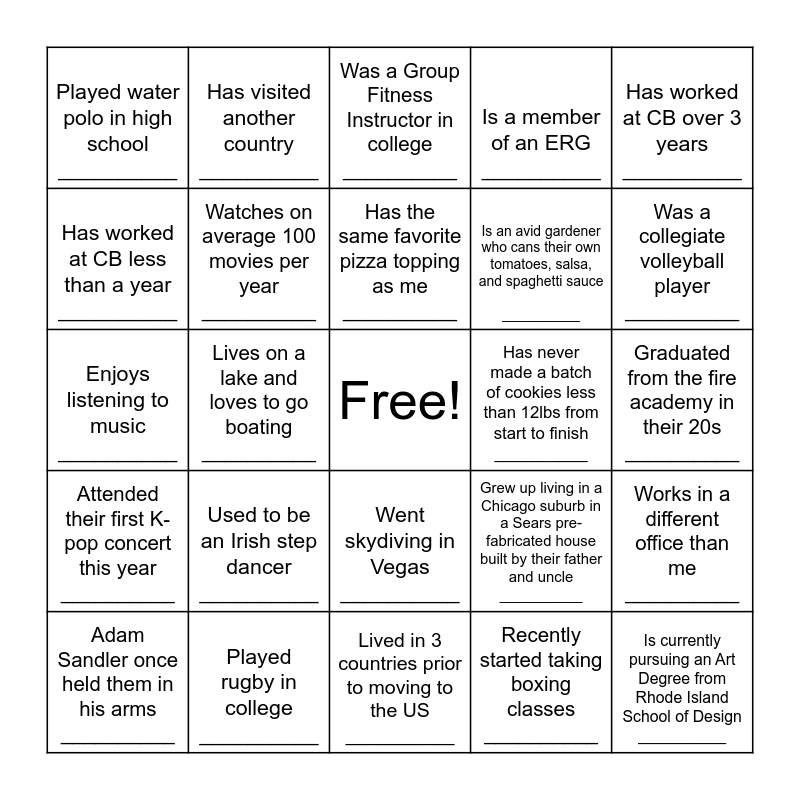 This bingo card has a free space and 29 words: Adam Sandler once held them in his arms __________, Collect sneakers and has over 100 pairs __________, Lives on a lake and loves to go boating __________, Had a distant relative that came over on the Mayflower __________, Played water polo in high school __________, Was a Group Fitness Instructor in college __________, Watches on average 100 movies per year __________, Used to be an Irish step dancer __________, Has never made a batch of cookies less than 12lbs from start to finish __________, Played rugby in college __________, Graduated from the fire academy in their 20s __________, Is currently pursuing an Art Degree from Rhode Island School of Design __________, Lived in 3 countries prior to moving to the US __________, Recently started taking boxing classes __________, Was a collegiate volleyball player __________, Spent a summer abroad in Alicante, Spain __________, Went skydiving in Vegas __________, Attended their first K-pop concert this year __________, Has worked at CB over 3 years __________, Enjoys listening to music __________, Grew up living in a Chicago suburb in a Sears pre-fabricated house built by their father and uncle __________, I have not met in person before __________, Is an avid gardener who cans their own tomatoes, salsa, and spaghetti sauce __________, Has worked at CB less than a year __________, Is a member of an ERG __________, Has visited another country __________, Works in a different office than me __________, Has the same favorite pizza topping as me __________ and Has a pet __________.
