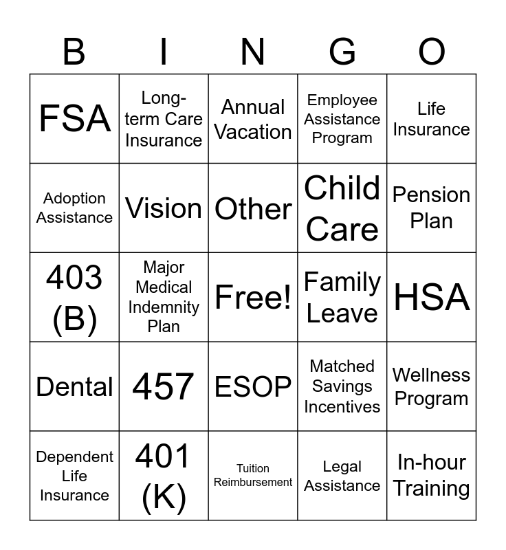 This bingo card has a free space and 33 words: HMO, PPO, Major Medical Indemnity Plan, Prescription Drug Plan, Dental, Vision, Life Insurance, Dependent Life Insurance, Long-term Care Insurance, Property & Casualty Insurance, Other, Annual Vacation, Holidays, Sick Leave, Family Leave, Pension Plan, 401 (K), 403 (B), 457, Matched Savings Incentives, ESOP, Retiree Health Insurance, FSA, HSA, Tuition Reimbursement, In-hour Training, Employee Assistance Program, Child Care, Adoption Assistance, Wellness Program, Health Challenge, Legal Assistance and Housing Assistance.