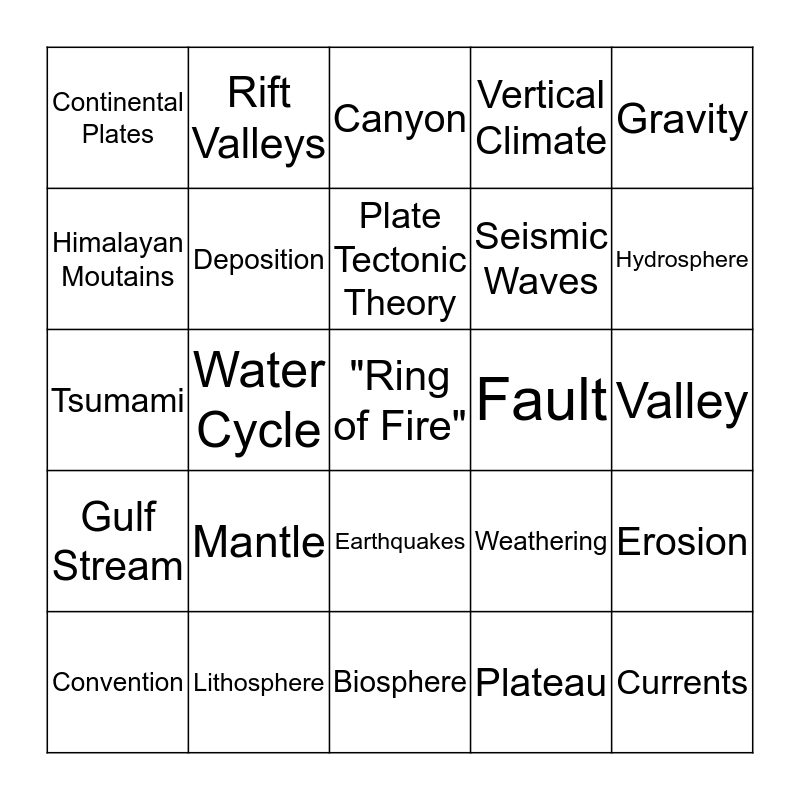 This bingo card has a free space and 24 words: Mantle, Lithosphere, Plate Tectonic Theory, Convention, Gravity, Continental Plates, Himalayan Moutains, Rift Valleys, Fault, Earthquakes, Seismic Waves, Tsumami, Weathering, Erosion, Deposition, Plateau, Valley, Canyon, Hydrosphere, Water Cycle, Currents, Gulf Stream, Vertical Climate and Biosphere.
