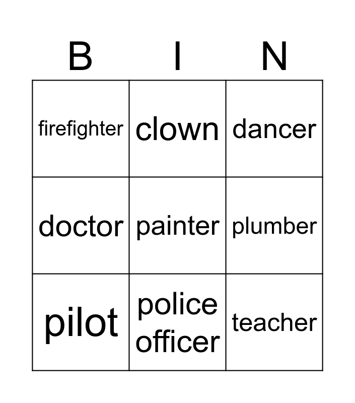 This bingo card has a free space and 8 words: doctor, clown, plumber, pilot, dancer, firefighter, police officer and teacher.