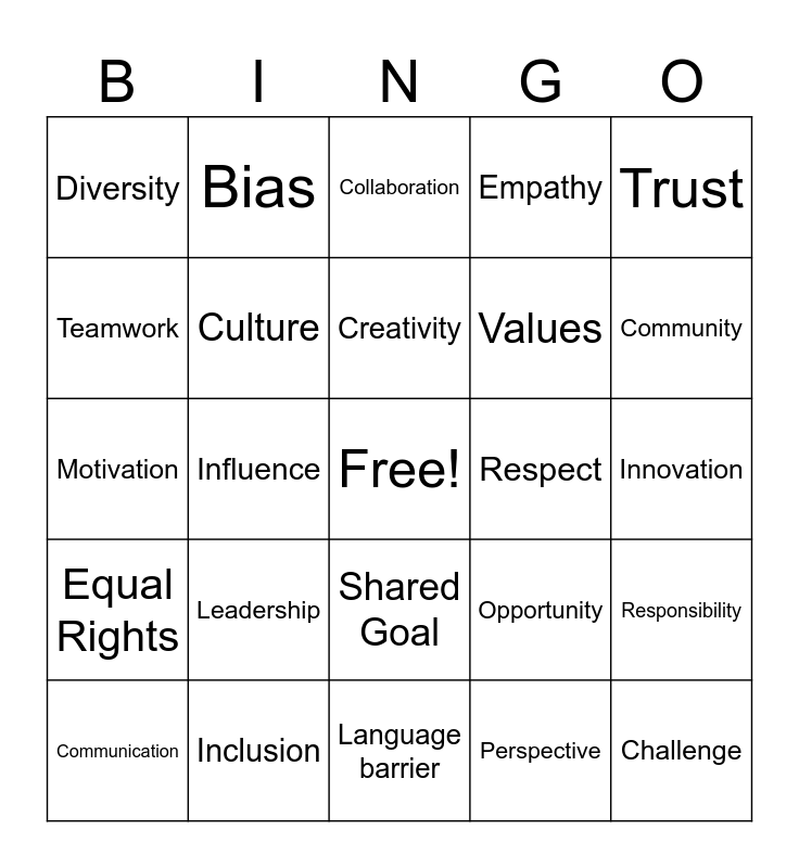 This bingo card has a free space and 24 words: Leadership, Inclusion, Creativity, Communication, Trust, Diversity, Teamwork, Bias, Respect, Shared Goal, Values, Motivation, Opportunity, Responsibility, Culture, Perspective, Innovation, Collaboration, Community, Influence, Challenge, Equal Rights, Empathy and Language barrier.