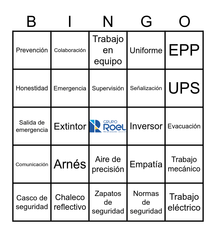 This bingo card has a free space and 29 words: Casco de seguridad, Trabajo en altura, Extintor, Guantes, Prevención, Trabajo en equipo, Emergencia, Arnés, Inversor, Chaleco reflectivo, Evacuación, Trabajo eléctrico, Zapatos de seguridad, Normas de seguridad, UPS, Respeto, Aire de precisión, Comunicación, EPP, Salida de emergencia, Empatía, Responsabilidad, Señalización, Honestidad, Uniforme, Colaboración, Trabajo mecánico, Supervisión and Sistemas contra incendios.