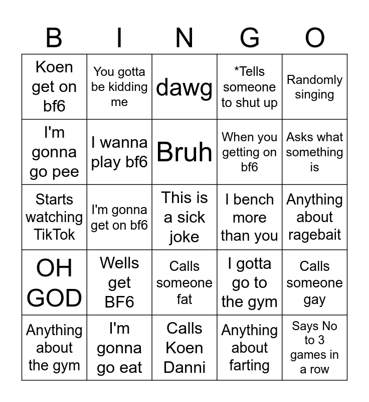 This bingo card has a free space and 24 words: Wells get BF6, I'm gonna go eat, Bruh, Anything about the gym, Randomly singing, Koen get on bf6, I'm gonna go pee, You gotta be kidding me, I bench more than you, Calls someone fat, When you getting on bf6, Starts watching TikTok, I gotta go to the gym, Calls someone gay, I wanna play bf6, Anything about farting, Anything about ragebait, dawg, Asks what something is, I'm gonna get on bf6, Says No to 3 games in a row, OH GOD, *Tells someone to shut up and Calls Koen Danni.