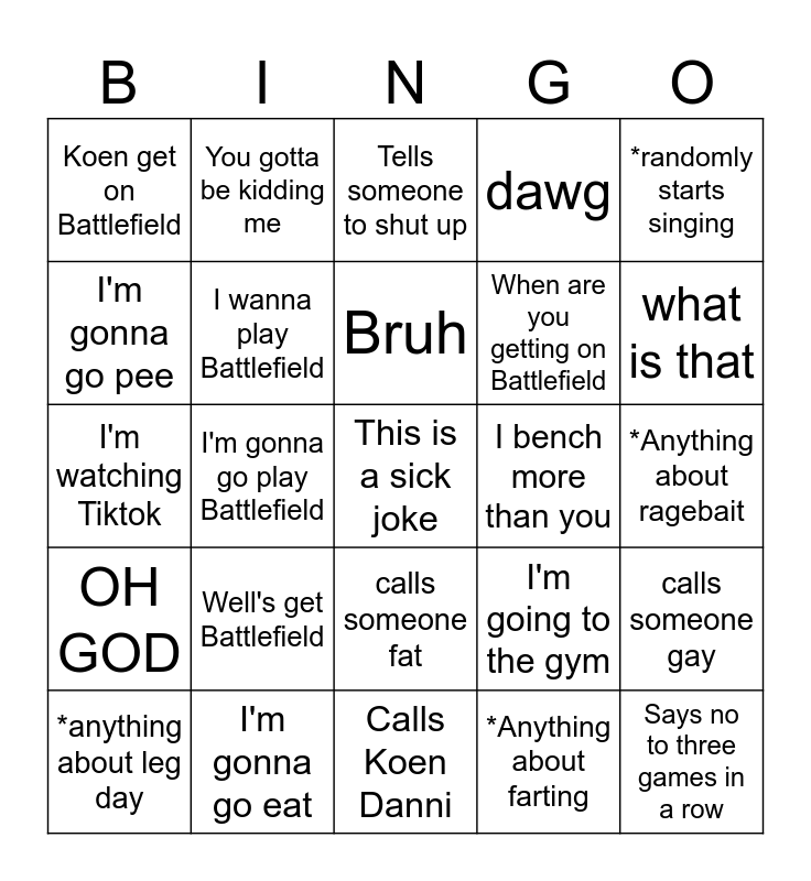 This bingo card has a free space and 24 words: Well's get Battlefield, I'm gonna go eat, Bruh, *anything about leg day, *randomly starts singing, Koen get on Battlefield, I'm gonna go pee, You gotta be kidding me, I bench more than you, calls someone fat, When are you getting on Battlefield, I'm watching Tiktok, I'm going to the gym, calls someone gay, I wanna play Battlefield, *Anything about farting, *Anything about ragebait, Tells someone to shut up, what is that, I'm gonna go play Battlefield, Says no to three games in a row, OH GOD, dawg and Calls Koen Danni.