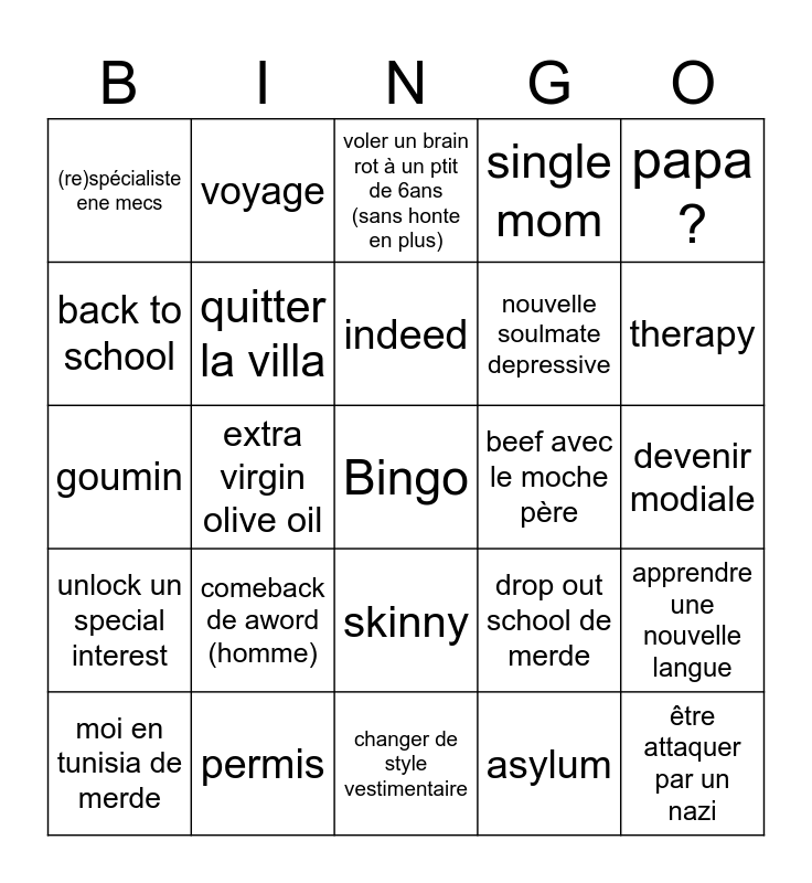 This bingo card has a free space and 24 words: comeback de aword (homme), permis, indeed, moi en tunisia de merde, papa ?, (re)spécialiste ene mecs, back to school, voyage, beef avec le moche père, skinny, nouvelle soulmate depressive, goumin, drop out school de merde, apprendre une nouvelle langue, quitter la villa, asylum, devenir modiale, voler un brain rot à un ptit de 6ans (sans honte en plus), therapy, extra virgin olive oil, être attaquer par un nazi, unlock un special interest, single mom and changer de style vestimentaire.