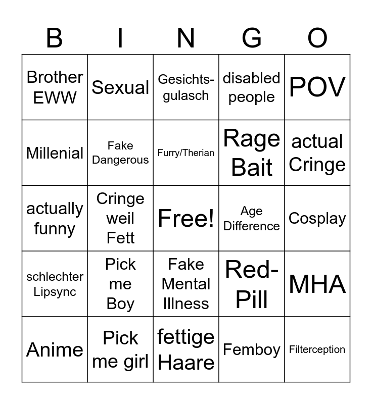 This bingo card has a free space and 24 words: Pick me Boy, Pick me girl, Furry/Therian, Anime, POV, Brother EWW, Millenial, Sexual, Age Difference, Fake Mental Illness, Rage Bait, actually funny, Red-Pill, MHA, Fake Dangerous, Femboy, Cosplay, Gesichts- gulasch, actual Cringe, Cringe weil Fett, Filterception, schlechter Lipsync, disabled people and fettige Haare.