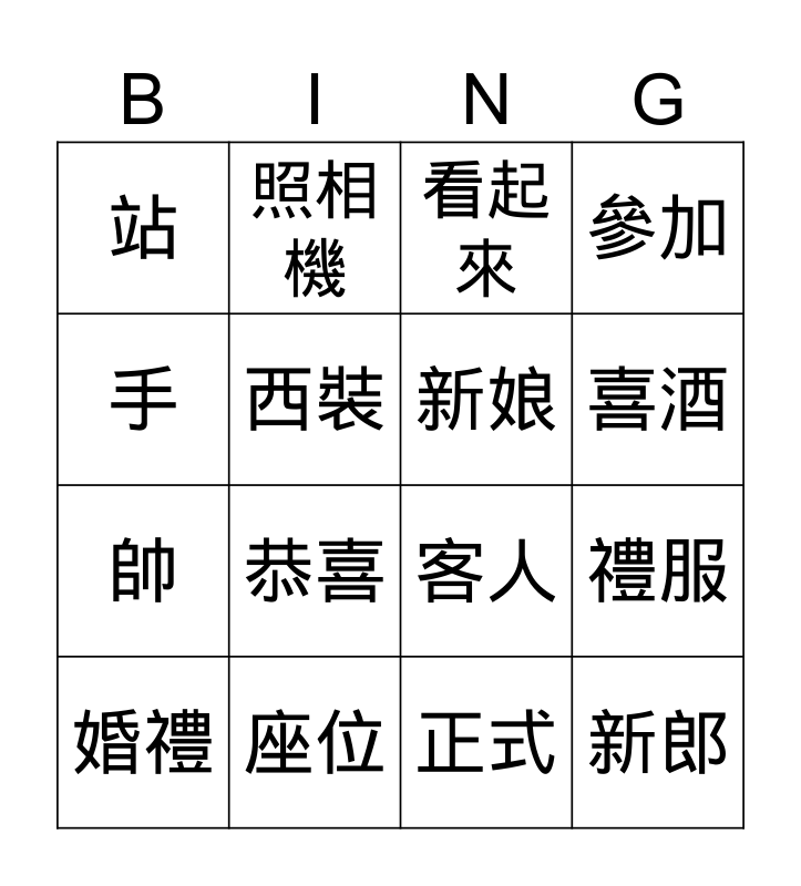 This bingo card has 16 words: 座位, 禮服, 看起來, 站, 帥, 照相機, 客人, 正式, 手, 西裝, 婚禮, 參加, 恭喜, 喜酒, 新娘 and 新郎.