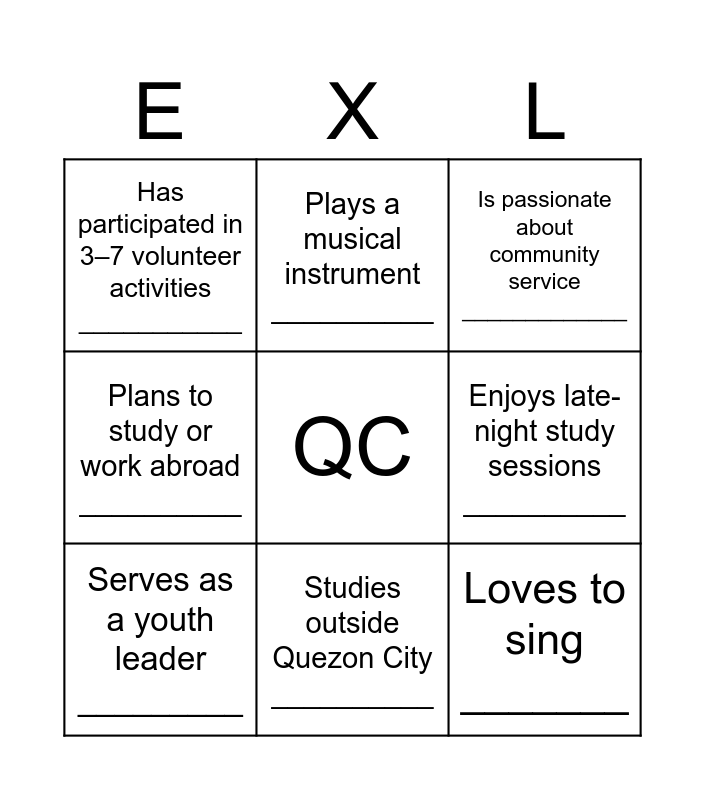 This bingo card has a free space and 8 words: Plans to study or work abroad __________, Plays a musical instrument __________, Enjoys late-night study sessions __________, Serves as a youth leader _________, Is passionate about community service _____________, Has participated in 3–7 volunteer activities ___________, Studies outside Quezon City __________ and Loves to sing _______.