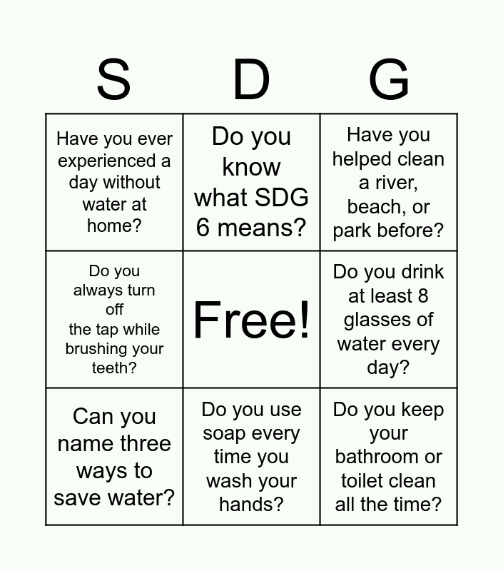 This bingo card has a free space and 8 words: Do you drink at least 8 glasses of water every day?, Have you helped clean a river, beach, or park before?, Do you know what SDG 6 means?, Can you name three ways to save water?, Have you ever experienced a day without water at home?, Do you keep your bathroom or toilet clean all the time?, Do you always turn off the tap while brushing your teeth? and Do you use soap every time you wash your hands?.