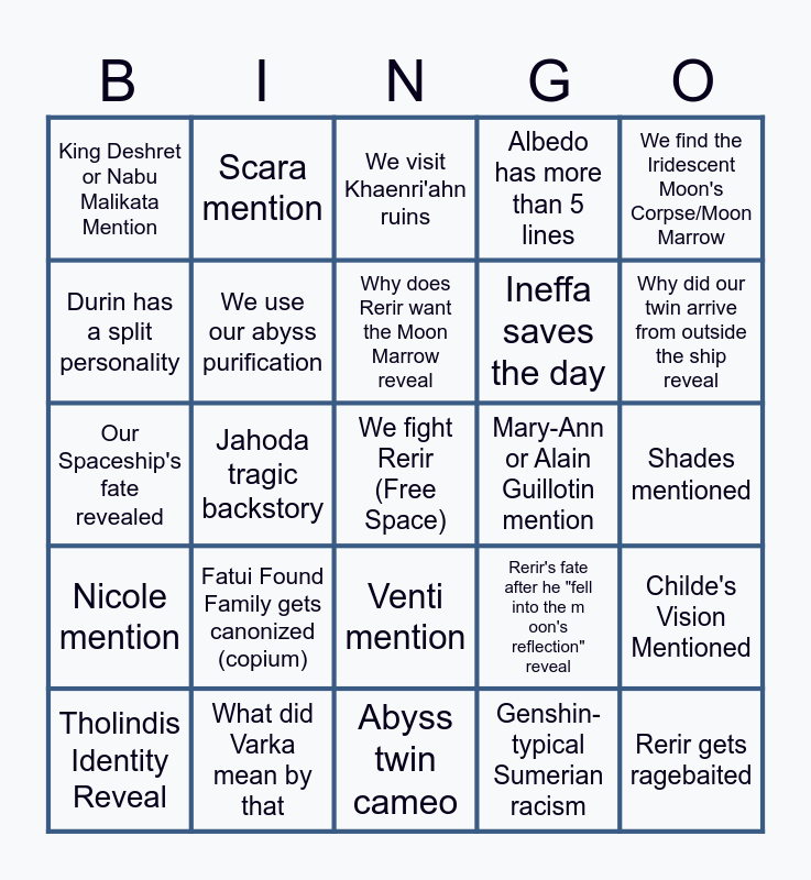 This bingo card has a free space and 34 words: Dottore Mentioned, Genshin-typical Sumerian racism, Capitano Mentioned, We see a different side of Sandrone, Nicole mention, We use our abyss purification, We find the Iridescent Moon's Corpse/Moon Marrow, Tholindis Identity Reveal, Scara mention, Someone complains about the heat, Why does Rerir want the Moon Marrow reveal, We visit Khaenri'ahn ruins, Descender Lore, Price of Columbina's Freedom revealed, Mary-Ann or Alain Guillotin mention, Why did our twin arrive from outside the ship reveal, What did Varka mean by that, Our Spaceship's fate revealed, Fatui Found Family gets canonized (copium), Rerir's fate after he "fell into the moon's reflection" reveal, Venti mention, Last Sinner's Sin reveal, King Deshret or Nabu Malikata Mention, Shades mentioned, Abyss twin cameo, Rerir gets ragebaited, Albedo has more than 5 lines, Dainsleif exists for more than 2 seconds, Ineffa saves the day, Durin has a split personality, Hexenzirkel Lore, Jahoda tragic backstory, Childe's Vision Mentioned and Pulonia lore.