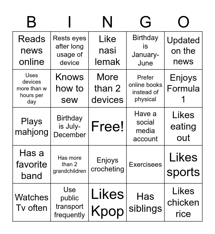 This bingo card has a free space and 24 words: Has more than 2 grandchildren, Use public transport frequently, More than 2 devices, Watches Tv often, Updated on the news, Reads news online, Uses devices more than w hours per day, Rests eyes after long usage of device, Have a social media account, Enjoys crocheting, Prefer online books instead of physical, Plays mahjong, Exercisees, Likes sports, Knows how to sew, Has siblings, Likes eating out, Like nasi lemak, Enjoys Formula 1, Birthday is July-December, Likes chicken rice, Has a favorite band, Birthday is January-June and Likes Kpop.