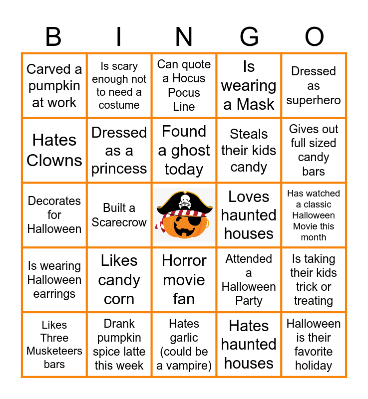 This bingo card has a free space and 29 words: Likes Three Musketeers bars, Is wearing a pumpkin, Built a Scarecrow, Wore a homemade costume today, Carved a pumpkin at work, Can quote a Hocus Pocus Line, Dressed as a princess, Likes candy corn, Loves haunted houses, Drank pumpkin spice latte this week, Has watched a classic Halloween Movie this month, Halloween is their favorite holiday, Hates garlic (could be a vampire), Hates haunted houses, Gives out full sized candy bars, Does not celebrate Halloween, Horror movie fan, Is wearing Halloween earrings, Dressed as superhero, Decorates for Halloween, Attended a Halloween Party, Owns a black cat, Steals their kids candy, Hates Clowns, Is wearing a Mask, Is scary enough not to need a costume, Is taking their kids trick or treating, Found a ghost today and Dresses up every year.