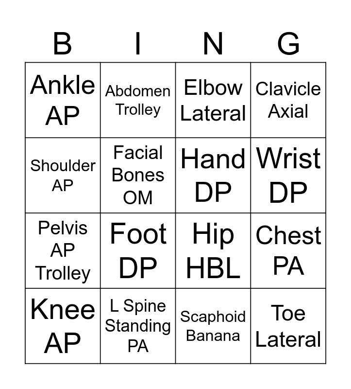 This bingo card has 20 words: Chest PA, C Spine AP, Elbow Lateral, Chest AP non grid, Knee AP, Shoulder AP, L Spine Standing PA, Ankle AP, Pelvis AP Trolley, Abdomen Trolley, Foot DP, Hip HBL, Facial Bones OM, Toe Lateral, Hand DP, L Spine Standing Lateral, Wrist DP, Clavicle Axial, Scaphoid Banana and Intercondylar Notch.