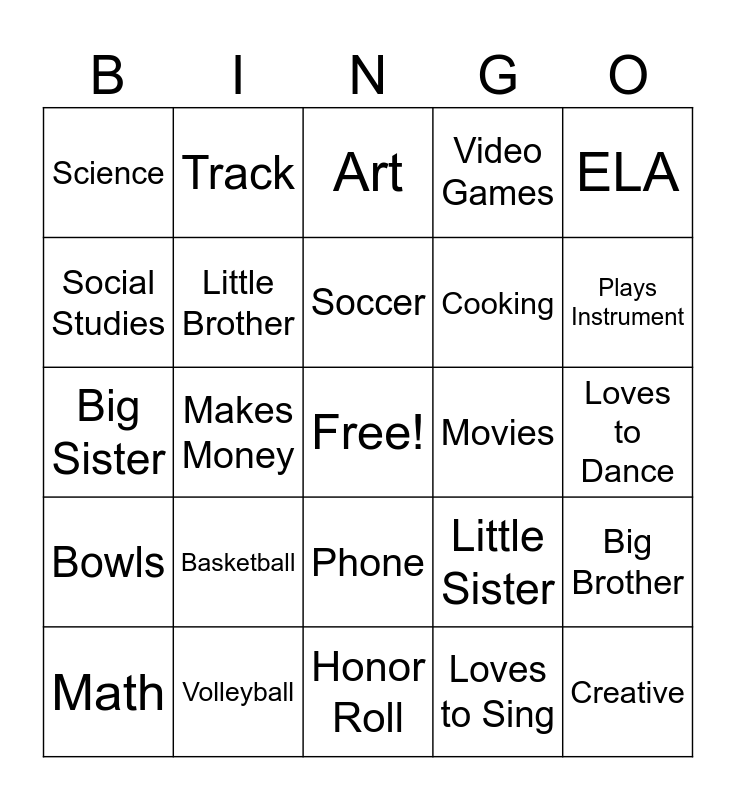 This bingo card has a free space and 24 words: Basketball, Volleyball, Soccer, Math, ELA, Science, Social Studies, Track, Movies, Phone, Cooking, Big Sister, Little Sister, Big Brother, Little Brother, Loves to Sing, Loves to Dance, Art, Plays Instrument, Makes Money, Creative, Bowls, Video Games and Honor Roll.