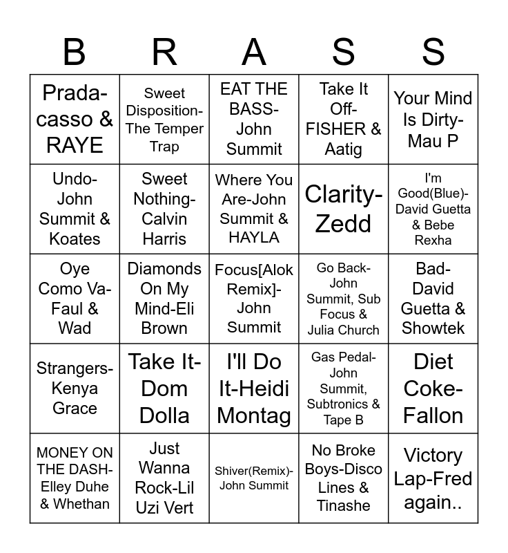 This bingo card has 50 words: Light Years-John Summit, Focus[Alok Remix]-John Summit, Hypnotized-Anyma, Ellie Goulding & John Summit, Shiver(Remix)-John Summit, Take It-Dom Dolla, girl$-Dom Dolla, Sweet Disposition-The Temper Trap, Up N Down-Kamino & MERYLL, Undo-John Summit & Koates, What About Me-Alterboy, Sweet Nothing-Calvin Harris, Take It Off-FISHER & Aatig, Diet Coke-Fallon, Gas Pedal-John Summit, Subtronics & Tape B, Resonate-John Summit & Julia Church, Kaskade, I Wanna Go-John Summit & Britney Spears, Where You Are-John Summit & HAYLA, Go Back-John Summit, Sub Focus & Julia Church, Rhyme Dust-Dom Dolla, Your Mind Is Dirty-Mau P, Diamonds On My Mind-Eli Brown, No Broke Boys-Disco Lines & Tinashe, Prada-casso & RAYE, Clarity-Zedd, Hurricane-Martin Garrix & Sentinel, Victory Lap-Fred again.., I'm Good(Blue)-David Guetta & Bebe Rexha, B.O.T.A-Eliza Rose, EAT THE BASS-John Summit, I'll Do It-Heidi Montag, FE!N-Travis Scott & Chase B, Better Off-Alan Walker, Dash Berlin & Vikkstar, Crying On The Dancefloor-Sam Feldt, Eat Your Man-Dom Dolla & Nelly Furtado, Just Wanna Rock-Lil Uzi Vert, Everytime We Touch-Cascada, Stephanie-Cloonee, Young M.A & InntRaw, Stereo Love-Edward Maya & Vika Jigulina, Everything You Do-Afroki, Bad-David Guetta & Showtek, IT GIRL-Aliyah's Interlude, Big Jet Plane-Raphael Palacci, EVIL J0RDAN-Playboi Carti, Outside-Calvin Harris, MONEY ON THE DASH- Elley Duhe & Whethan, Oye Como Va-Faul & Wad, Innerbloom-RUFUS DU SOL, Sacrifice-The Weeknd, Strangers-Kenya Grace and Stay The Night-Zedd.