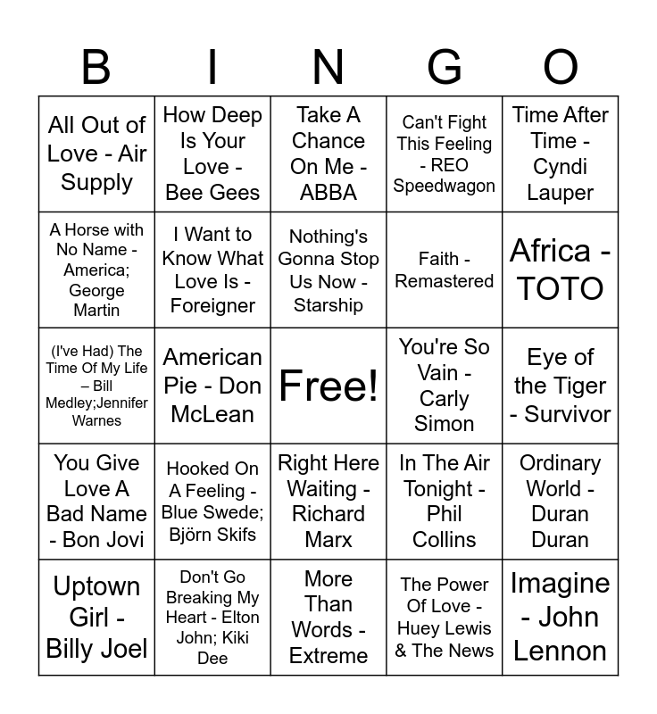 This bingo card has a free space and 73 words: Don't Stop Believin’ Journey, Faithfully - Journey, All Out of Love - Air Supply, Livin' On A Prayer - Bon Jovi, Your Love - The Outfield, Summer Of '69 Bryan Adams, You Give Love A Bad Name - Bon Jovi, Old Time Rock & Roll - Bob Seger, In The Air Tonight - Phil Collins, Take It Easy - Eagles, Take on Me - a-ha, Have You Ever Seen The Rain - Creedence Clearwater Revival, I Want to Know What Love Is - Foreigner, Eye of the Tiger - Survivor, I Still Haven't Found What I'm Looking For - U2, How Deep Is Your Love - Bee Gees, More Than Words - Extreme, A Horse with No Name - America; George Martin, Bennie And The Jets - Elton John, You're So Vain - Carly Simon, Nothing's Gonna Stop Us Now - Starship, Can't Fight This Feeling - REO Speedwagon, Time After Time - Cyndi Lauper, Waiting for a Girl like You - Foreigner, Uptown Girl - Billy Joel, Dancing In the Dark - Bruce Springsteen, Rocket Man - Elton John, Don't You (Forget About Me), More Than a Feeling - Boston, Maneater - Daryl Hall & John Oates, Don't Go Breaking My Heart - Elton John; Kiki Dee, Total Eclipse of the Heart - Bonnie Tyler, Sweet Home Alabama - Lynyrd Skynyrd, Heaven Is A Place On Earth - Belinda Carlisle, American Pie - Don McLean, You Make My Dreams (Come True) - Daryl Hall & John Oates, I Don't Want To Miss A Thing - Aerosmith, November Rain - Guns N' Roses, Imagine - John Lennon, My Life - Billy Joel, The Power Of Love - Huey Lewis & The News, Hooked On A Feeling - Blue Swede; Björn Skifs, Smooth Operator - Sade, Every Breath You Take - The Police, Got My Mind Set on You - George Harrison, Faith - Remastered, Take A Chance On Me - ABBA, Everybody Wants To Rule The World - Tears For Fears, The Way You Make Me Feel - Michael Jackson, (I've Had) The Time Of My Life – Bill Medley;Jennifer Warnes, Fast Car - Tracy Chapman, Every Little Thing She Does Is Magic - The Police, Johnny B. Goode - Chuck Berry, We Built This City - Starship, (I Just) Died In Your Arms - Cutting Crew, With Or Without You - U2, The Boys Of Summer - Don Henley, Right Here Waiting - Richard Marx, Sara - Starship, Got a Hold on Me - Christine McVie, Come Together - The Beatles, Hungry Eyes - Eric Carmen, Da Ya Think I'm Sexy? - Rod Stewart, Africa - TOTO, Here Comes The Sun - The Beatles, Kiss from a Rose - Seal, Purple Rain - Prince, Knockin' On Heaven's Door - Guns N' Roses, Ordinary World - Duran Duran, Shout - Tears For Fears, Oh, Pretty Woman - Roy Orbison, The Look - Roxette and Ain't No Mountain High Enough - Marvin Gaye; Tammi Terrell.
