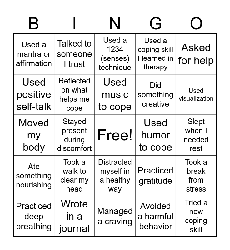 This bingo card has a free space and 24 words: Took a walk to clear my head, Wrote in a journal, Used music to cope, Practiced deep breathing, Asked for help, Used a mantra or affirmation, Used positive self-talk, Talked to someone I trust, Used humor to cope, Distracted myself in a healthy way, Did something creative, Moved my body, Practiced gratitude, Took a break from stress, Reflected on what helps me cope, Avoided a harmful behavior, Slept when I needed rest, Used a 1234 (senses) technique, Used visualization, Stayed present during discomfort, Tried a new coping skill, Ate something nourishing, Used a coping skill I learned in therapy and Managed a craving.