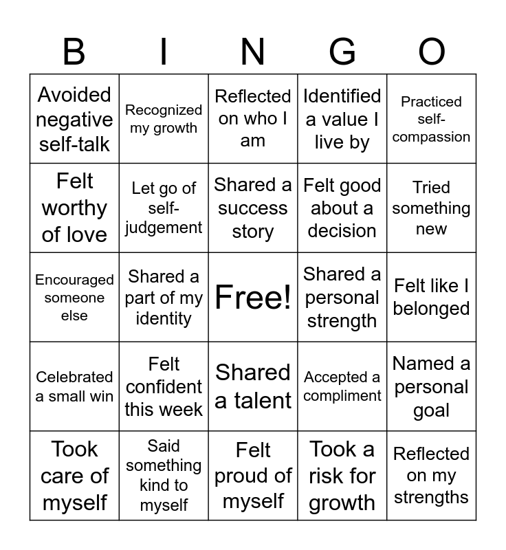 This bingo card has a free space and 24 words: Felt confident this week, Said something kind to myself, Shared a success story, Took care of myself, Practiced self-compassion, Avoided negative self-talk, Felt worthy of love, Recognized my growth, Shared a personal strength, Shared a talent, Felt good about a decision, Encouraged someone else, Accepted a compliment, Named a personal goal, Let go of self-judgement, Took a risk for growth, Felt like I belonged, Reflected on who I am, Tried something new, Shared a part of my identity, Reflected on my strengths, Celebrated a small win, Identified a value I live by and Felt proud of myself.