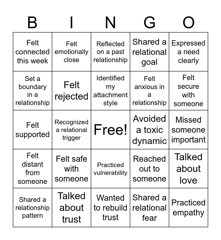 This bingo card has a free space and 24 words: Felt safe with someone, Talked about trust, Identified my attachment style, Shared a relationship pattern, Expressed a need clearly, Felt connected this week, Set a boundary in a relationship, Felt emotionally close, Avoided a toxic dynamic, Practiced vulnerability, Felt anxious in a relationship, Felt supported, Reached out to someone, Talked about love, Felt rejected, Shared a relational fear, Missed someone important, Reflected on a past relationship, Felt secure with someone, Recognized a relational trigger, Practiced empathy, Felt distant from someone, Shared a relational goal and Wanted to rebuild trust.