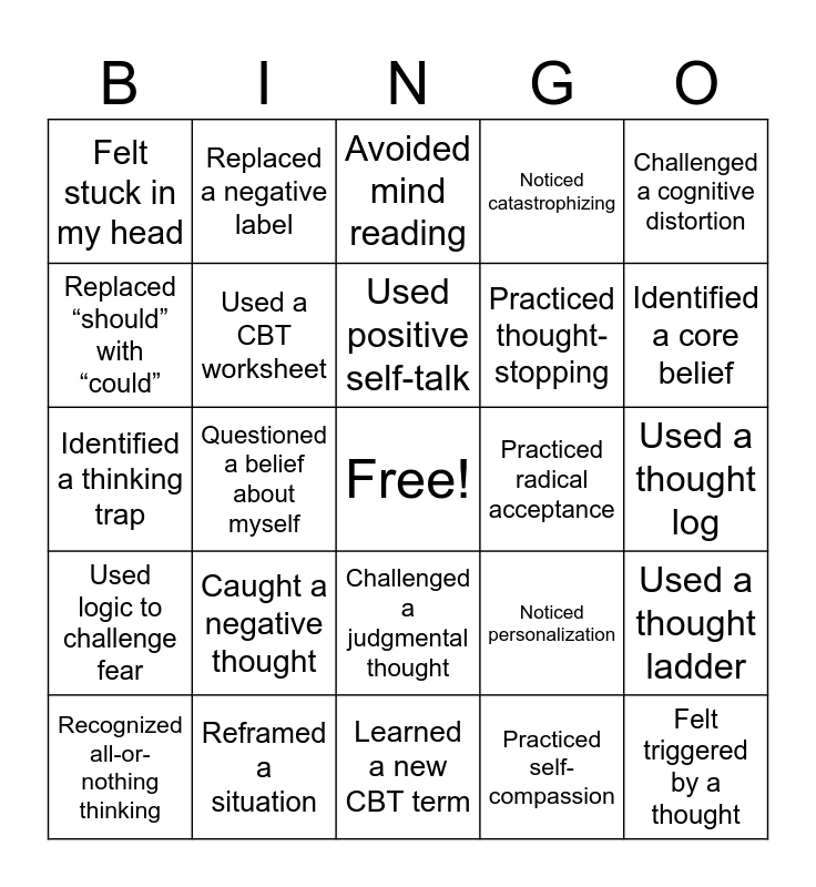 This bingo card has a free space and 24 words: Caught a negative thought, Reframed a situation, Used positive self-talk, Recognized all-or-nothing thinking, Challenged a cognitive distortion, Felt stuck in my head, Replaced “should” with “could”, Replaced a negative label, Practiced radical acceptance, Challenged a judgmental thought, Practiced thought-stopping, Identified a thinking trap, Noticed personalization, Used a thought ladder, Used a CBT worksheet, Practiced self-compassion, Used a thought log, Avoided mind reading, Identified a core belief, Questioned a belief about myself, Felt triggered by a thought, Used logic to challenge fear, Noticed catastrophizing and Learned a new CBT term.