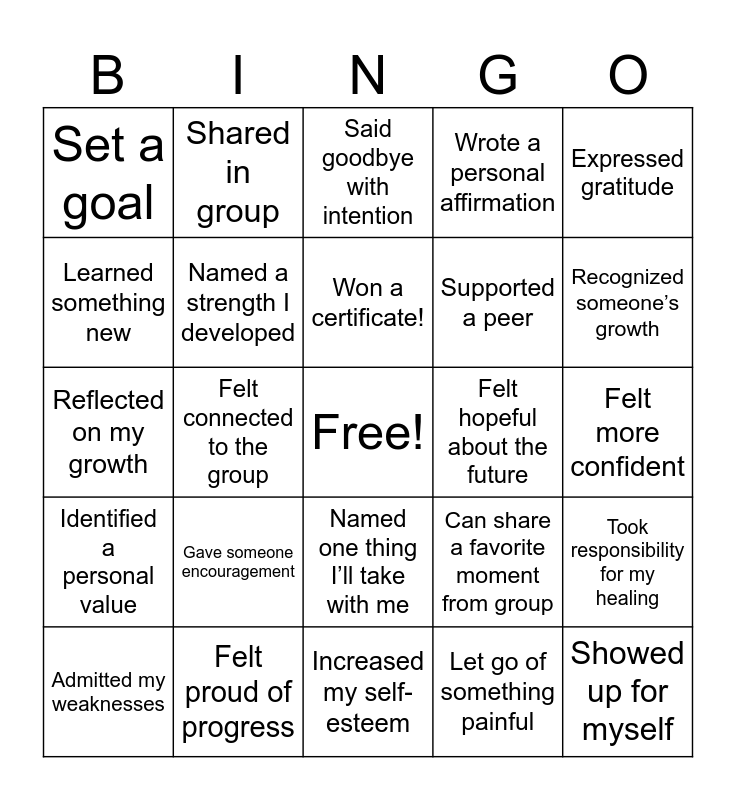 This bingo card has a free space and 24 words: Gave someone encouragement, Felt proud of progress, Won a certificate!, Admitted my weaknesses, Expressed gratitude, Set a goal, Learned something new, Shared in group, Felt hopeful about the future, Named one thing I’ll take with me, Supported a peer, Reflected on my growth, Can share a favorite moment from group, Took responsibility for my healing, Named a strength I developed, Let go of something painful, Felt more confident, Said goodbye with intention, Recognized someone’s growth, Felt connected to the group, Showed up for myself, Identified a personal value, Wrote a personal affirmation and Increased my self-esteem.