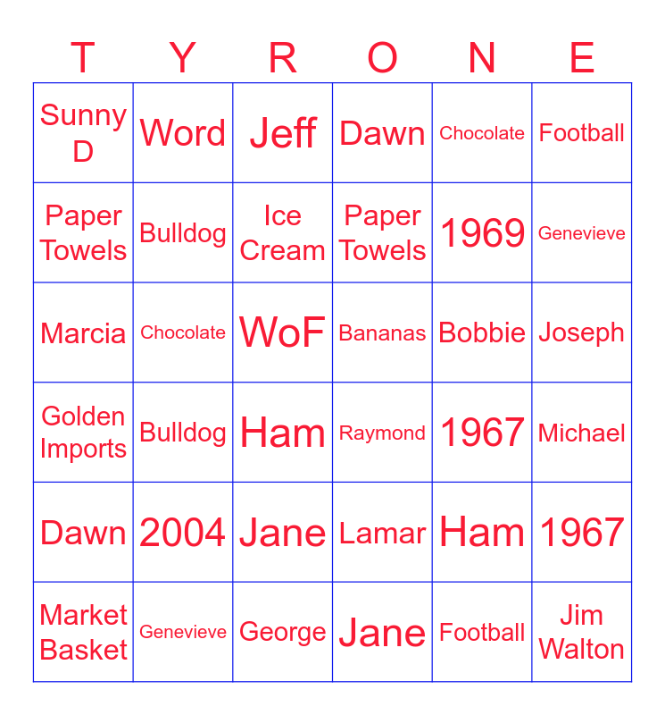 ⚠ This card has duplicate items: Word (2), Baseball (2), Football (2), 1967 (2), Joseph (2), Dawn (2), Bananas (2), Ice Cream (2), Air Force (2), Ham (2), Nesquik (2), Paper Towels (2), Sunny D (2), Jim Walton (2), 1969 (2), Golden Imports (2), Chocolate (2), 2004 (2), WoF (2), Bobbie (2), Bulldog (2), Lamar (2), Market Basket (2), Brookshire Brothers (2), Tycie (2), Bailey (2), Genevieve (2), Hettig (2), Raymond (2), George (2), Jeff (2), Corrine (2), Michael (2), Jane (2)